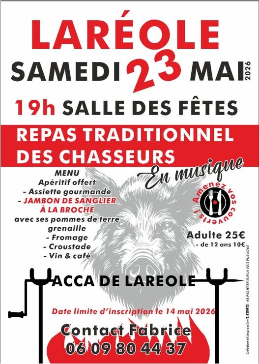 L’ACCA (Association Communale de Chasse Agréée) de Laréole organise le repas des chasseurs le samedi 23 mai à partir de 19h . Le repas sera préparé par Broch Traiteur qui vous régalera !