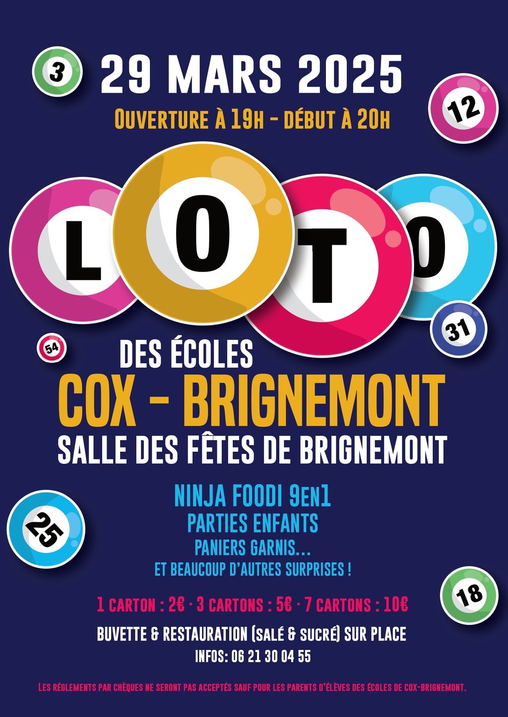 Cette année encore, l'APE de Cox et de Brignemont vous propose son loto annuel. Vous retrouverez sur place une buvette, avec une solution de restauration.