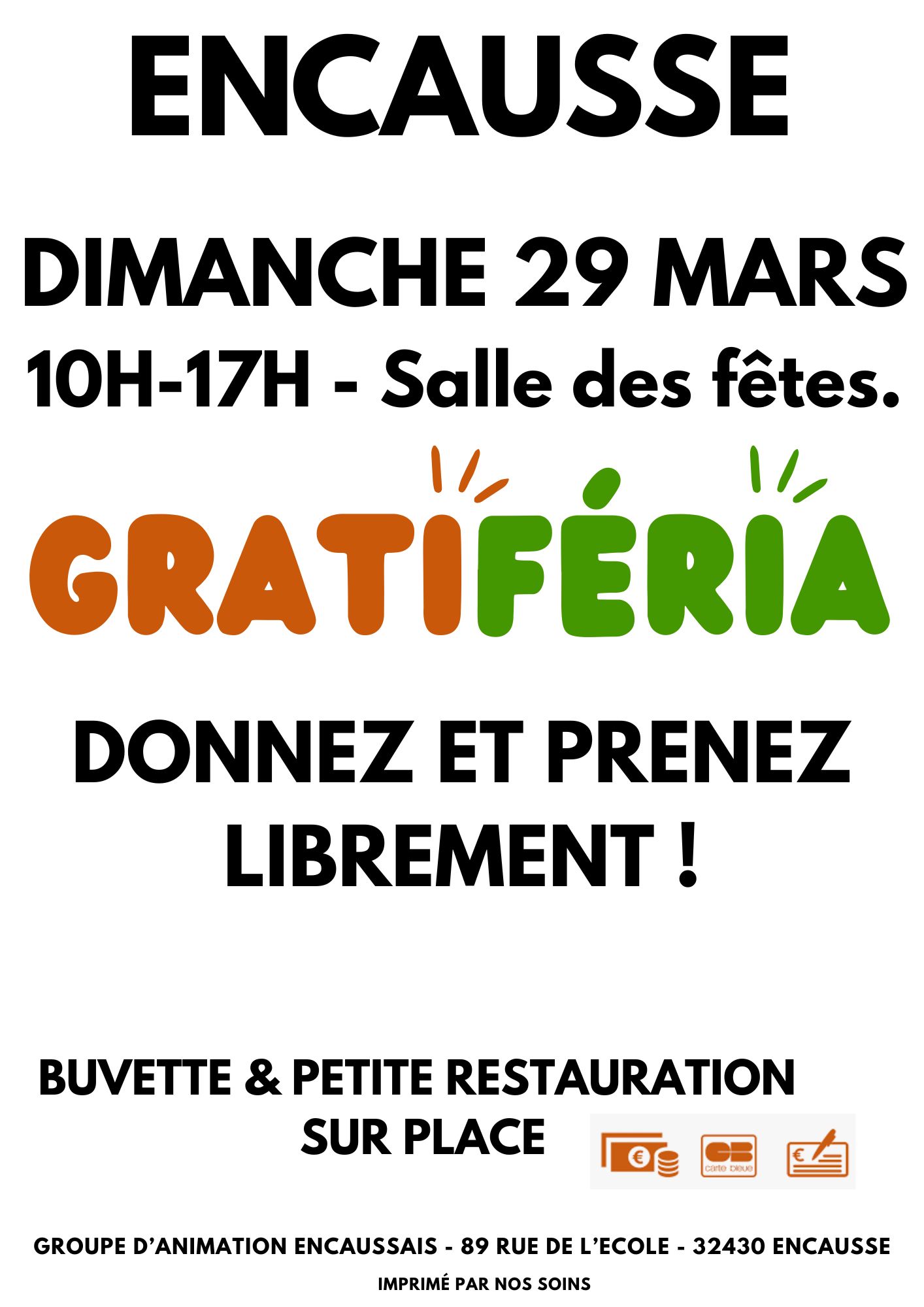 Retrouvez le comité des fêtes d'Encausse à salle des fêtes d’Encausse pour une nouvelle édition de la GRATIFERIA. Le concept est simple : donnez et prenez librement. Cette foire gratuite repose sur la base de l'échange et du don. Venez avec ou sans objet et trouvez votre bonheur parmi les Lire la suite